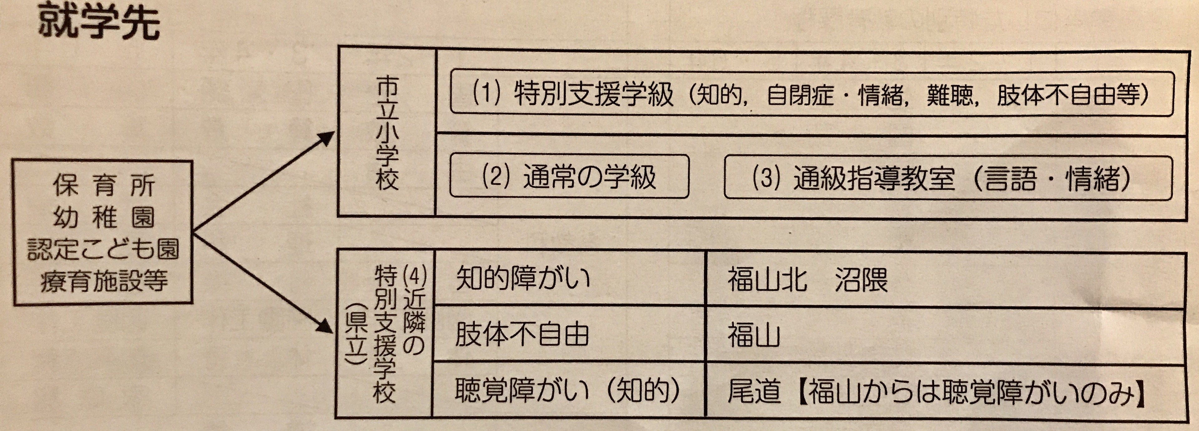 上図のように、支援が必要な児童は小学校から(1)~(4)を選択することになるのですが、保護者としてはそれぞれどのような教育が行われ、自分の子供にとっては何が最適なのか、十分な情報が必要になります。
