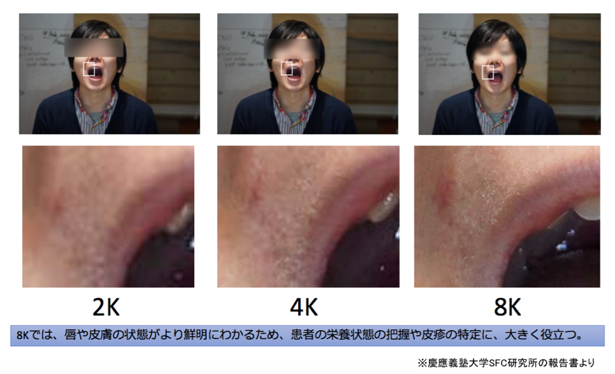 それにしても、医療における8Kカメラの活躍は目を見張るものがありました。実際に病院と患者役の方が待機する施設とをつないで行ったデモ治療を拝見し、とても驚いたのですが、映像の精度が高まれば高まるほど、唇や皮膚、網膜などの状態は一目瞭然でした。