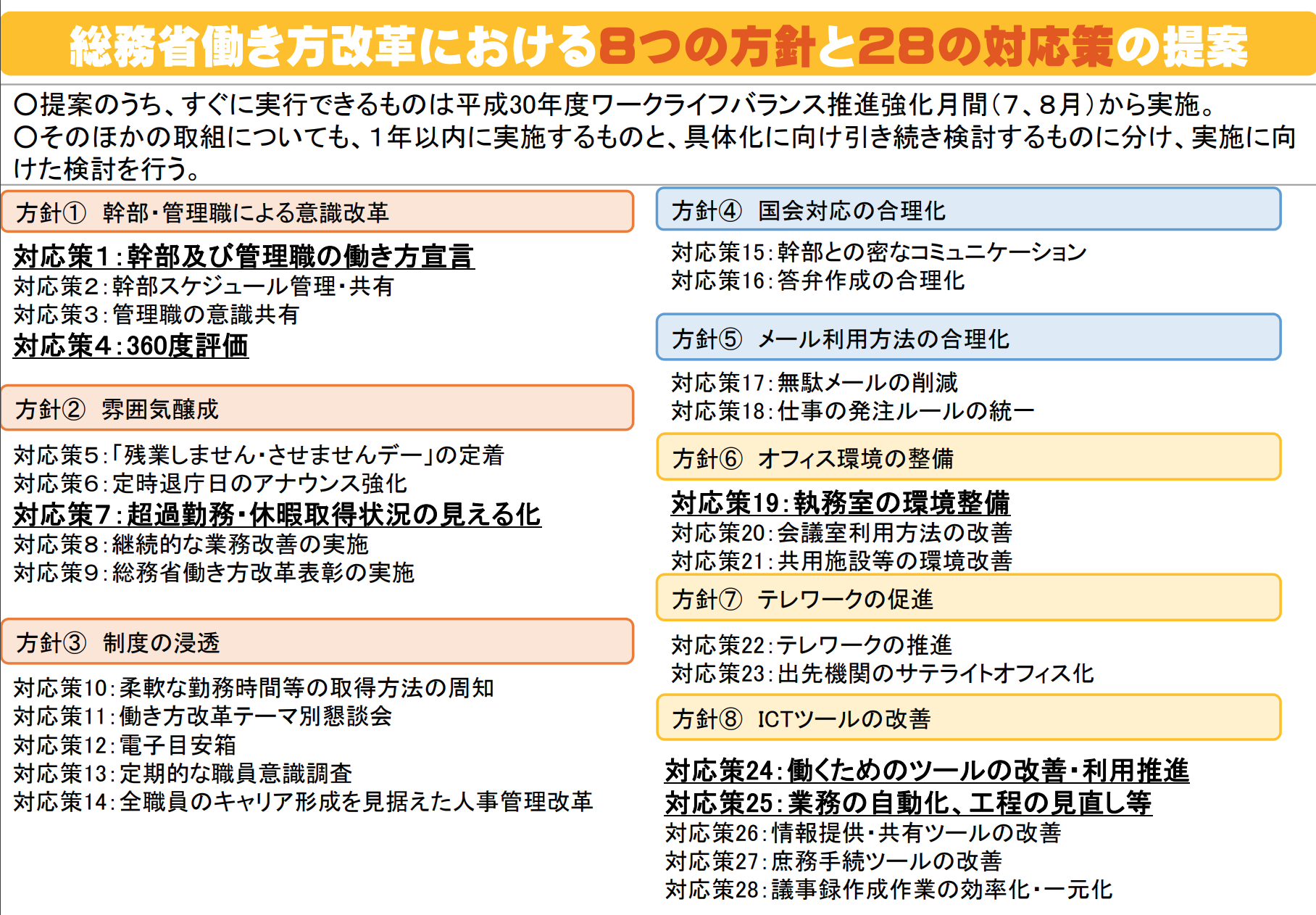総務省内でも中堅若手職員の有志が、育児・介護と仕事との両立、超過勤務の縮減、ICT化による業務効率化といった課題解決にむけて具体的な工程表をつくり、働きやすく、魅力ある職場づくりの提案に結びつけました。