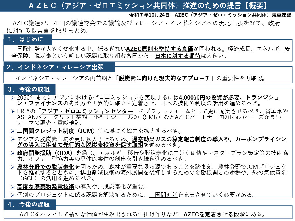 ○ 昨年 10 月の AZEC 首脳会合において採択された「今後 10 年のためのア クションプラン」に基づき、以下の取組を推進するべき。