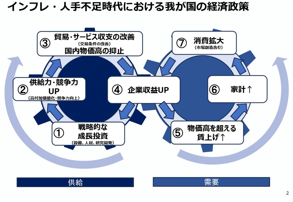 だからこそ、同時に供給側(図の左側)の政策に取り組み、物価を抑制しつつ、競争力を上げ、海外から稼ぐ力をつけていく必要があります。