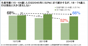 現在、統計上使われる生産年齢人口の年齢基準は15−64歳となっており、社会保障の将来を考えるときにもこれを基準に論じられています。その結果、2045年には一人の現役世代が一人のシニアを支える社会になるという話になっています。