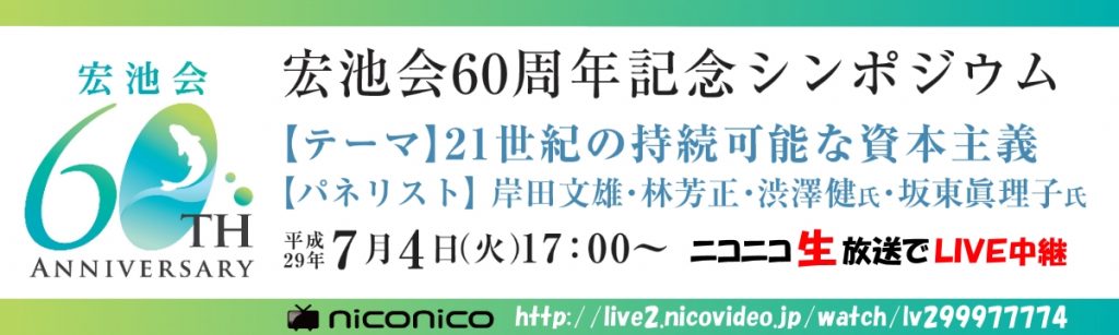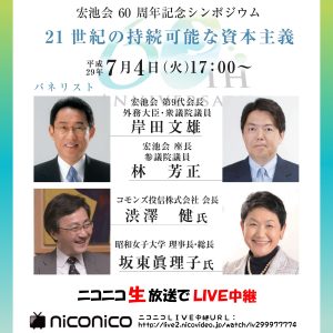 私が所属する宏池会の創立60周年の節目として、平成29年7月4日(火) に記念シンポジウムを開催します。なお、当日は「ニコニコ生放送」 にてシンポジウムの様子をライブ配信します。