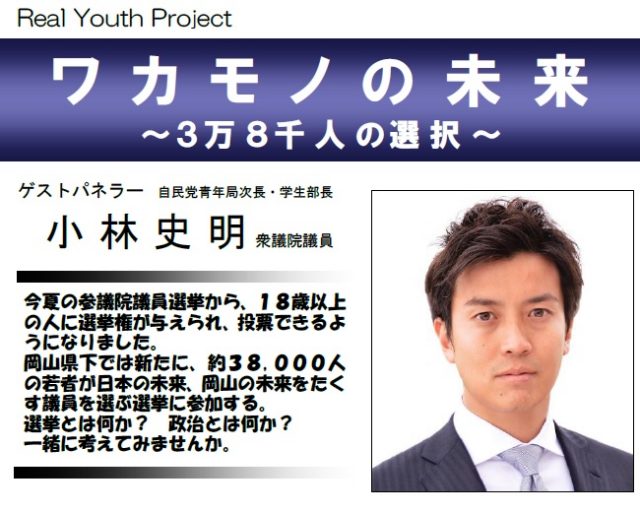 衆議院議員 小林史明は、自民党岡山県連青年部主催として開かれる「Real Youth Project ワカモノの未来 ~3万8千人の選択~」にゲストとして出演します。 ■Real Youth Project ワカモノの未 […]
